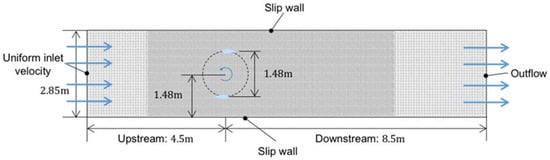 The numerical model neglects the rotor shaft and support struts, and utilizes an unsteady Reynolds-averaged Navier-Stokes (URANS) formulation with - shear stress transport (SST) turbulence closure scheme in OpenFOAM. The URANS approach is an attractive, computationally inexpensive prospect for far-wake simulation []. The - SST turbulence model used is the original Menter model [], which has been used successfully for many different types of flows. The SST (shear stress transport) turbulence model combines the - model in the free shear flow, with the - model in the near wall boundary regions. It is a robust two-equation eddy-viscosity turbulence model []. We would like further to develop our vertical-axis turbine model by adding solid support struts as a conventional turbine, which would enable our model to be used to represent a wide range of vertical-axis turbines and turbine farms in the future. We thus chose to use a - SST model instead of a - model in this paper. Whilst there would be undoubted merit in exploring the effect of different turbulence models on the results, as undertaken by Barthelmie et al. [], this is beyond the scope of the present work, but is recommended for future study.