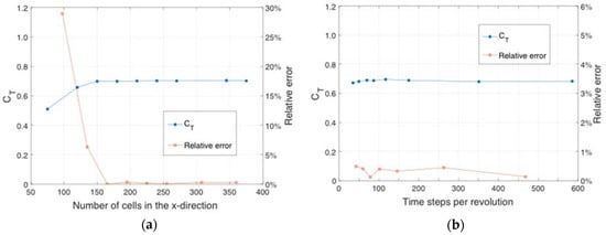 Sensitivity studies concerning spatial and temporal resolution will be discussed in this section. We first considered the convergence of turbine mean thrust coefficient for a tip-speed ratio of , shown in Figure 4. Mesh refinement is conducted by changing the number of cells in the -direction with a fixed cell aspect ratio and mesh topology. The relative error [] between the results from the two finest meshes is below , indicating that mesh convergence had been achieved. The spatial mesh resolution is hitherto set to cells in the stream-wise -direction, with about covering a single blade chord, (where the error between the finest mesh and the mesh employed is about ), giving a total number of cells in the 3D simulation. Details of a mesh sensitivity study of the near-wake vorticity field are provided in the first part of Appendix B. Figure 4b displays time-step resolution test data, evaluated on the 3D grid with cells in the -direction. The relative error is below , indicating low sensitivity to temporal resolution. In all these convergence tests, the Courant–Friedrichs–Lewy (CFL) number [] is below . In this study, we employed , corresponding to time steps per revolution, giving a CFL number of . Simulations were carried out lasting at least revolutions, with periodic convergence reached after revolutions when the difference in maximum turbine thrust between successive revolutions was .