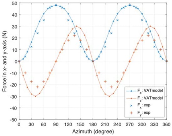 We now present results obtained for a two-bladed H-type vertical axis wind turbine where the tip speed ratio is set to a fixed value. Figure 5 compares the numerical predictions and measured thrust and lateral force components on the rotor for an incoming flow speed of , a fixed pitch angle of , and a tip-speed ratio (TSR) of . The measurements were averaged over turbine rotations. It can be seen that the numerical predictions and experimental measurements of the force components in both - and - directions are similar in terms of amplitude and profile, with the maximum thrust loading experienced at the blade azimuth at and .