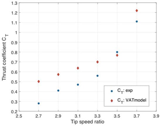 Comparison between predicted and measured [] mean thrust coefficient as a function of tip speed ratio in the range from to , for a wind turbine rotor of a two-bladed H-type vertical-axis wind turbine with incoming flow speed of and fixed pitch blade angle of .