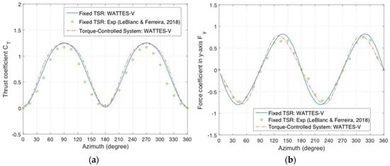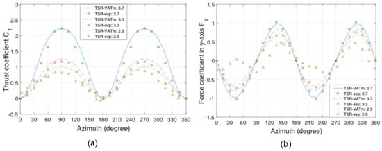Comparison between predicted and measured [] thrust and lateral force coefficients for different values of tip-speed ratio (TSR) (, , and ) as functions of azimuthal angle: (a) Thrust coefficient ; and (b) Lateral force coefficient .
