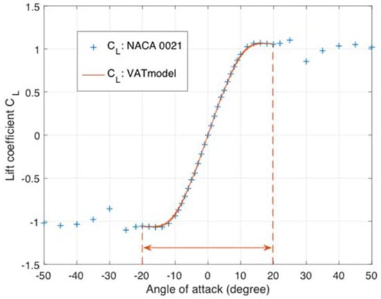 Lift coefficient as a function of local angle of attack at each grid point predicted by the VAT model for TSR , compared with measurements for a static airfoil []; the red dashed lines show the range of local angle of attack.