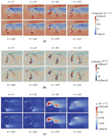 Flow patterns at eight different phases during a single revolution for TSR : (a) Velocity magnitude (); (b) -component of vorticity (); and (c) Turbulence kinetic energy () in the central horizontal - plane.