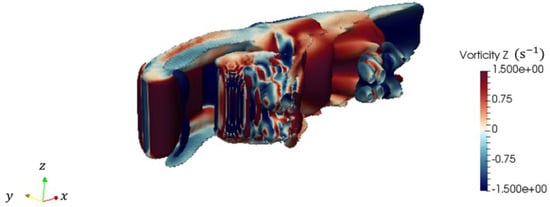 Snapshot of vorticity iso-surfaces, coloured according to -component.