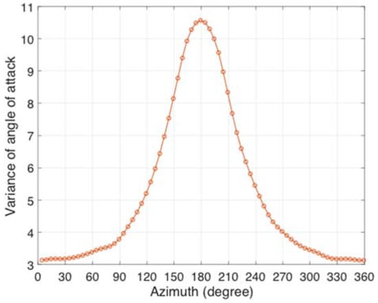 Variance of angle of attack as a function of azimuthal angle at TSR .