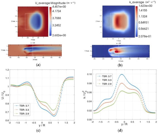 Near wake flow at and : (a) Slices through the mean velocity field in the - and - planes at TSR ; (b) Slices through the mean turbulence kinetic energy contours at TSR ; (c) Mean stream-wise velocity profiles for TSR , , and ; and (d) Mean turbulence kinetic energy profiles for TSR , , and .