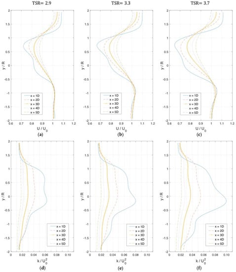 Horizontal profiles at mid-elevation of turbine : mean stream-wise velocity component (a) TSR , (b) TSR , (c) TSR ; and turbulence kinetic energy (d) TSR , (e) TSR , (f) TSR .