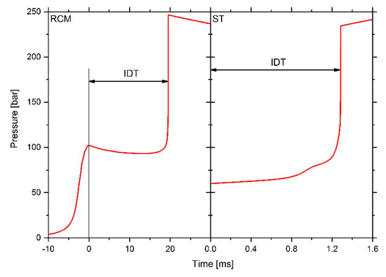 Simulated pressure curve and ignition delay time (IDT)-definition for rapid compression machine (RCM) (left) and shock tube (ST) (right).