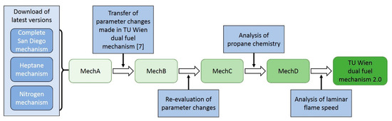 The further development process is explained in the following and is shown graphically in Figure 2. First, the Arrhenius parameter changes made in [7] were transferred to the mechanism MechA. Second, a re-evaluation of the Arrhenius parameter changes was made. In the third step, the overestimation of the IDT-reducing effect of the propane addition to methane was investigated. In the fourth step, the laminar flame speed of methane–air mixtures was simulated and compared with experimental values taken from the literature. Derived from this comparison, the final adaptation of the mechanism was performed. It should be noted that during the whole optimization process the thermodynamic and transport data remained unchanged and therefore correspond to the original data files of the Complete San Diego mechanism.