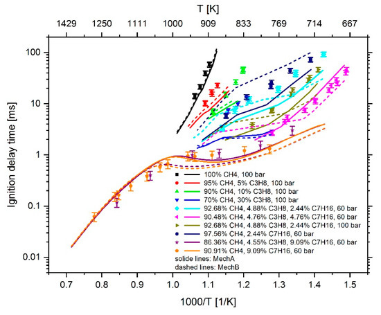In the mechanism presented in [7], the Arrhenius parameters of eight reactions were adjusted, including three methane reactions and five reactions of the n-heptane sub-mechanism. The main target of the adaption was to reduce the difference between the pressure curve (and derived therefrom the point of ignition) measured in a RCEM, operated in dual fuel mode with diesel and natural gas, and the corresponding CFD simulation results. The current study concentrates on the kinetically controlled ignition processes, especially in homogeneous mixtures, in order to exclude influences on the ignition due to inhomogeneities in the fuel–air mixture caused by diesel spray injection. As can be seen in Figure 3, the IDT calculated with MechB at an n-heptane content of about 9 mol% is underestimated for a temperature lower than 1000 K in which the reactions of the n-heptane sub-mechanism have a major impact on overall reactivity. Therefore, the changes made in the n-heptane sub-mechanism were re-evaluated. As mentioned before, some of the changes made to the Arrhenius parameters are large and partly outside the range that can be argued with data from the literature, which is an additional reason to re-evaluate the adjustments of all reactions considered.