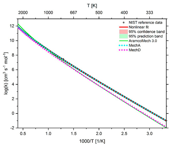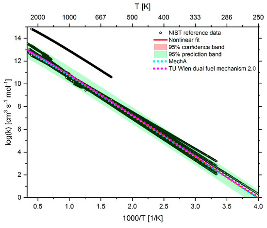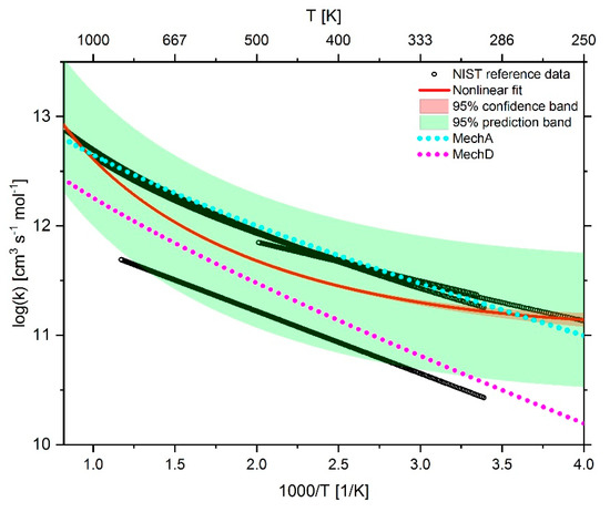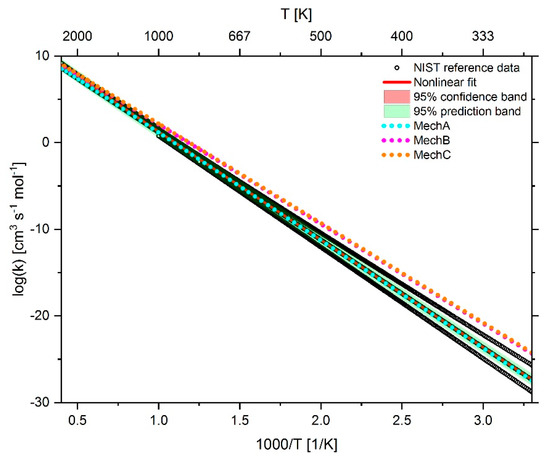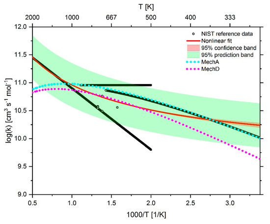 The effect of adjusting the Arrhenius parameters on the reaction rate coefficients is shown in Figure 4, Figure 5 and Figure 6. In addition to the reaction rate coefficients, the graphs also show the fit function as well as the 95% prediction band in green and the 95% confidence band in red of the fit function. The confidence band is mostly so narrow that it is usually covered by the fit curve. The data from the NIST database are represented as black open circles. Due to the plot density with a temperature resolution of 1 K, the NIST data points usually appear as black lines.