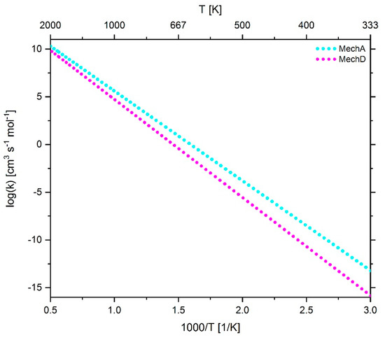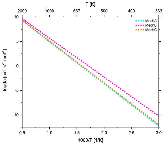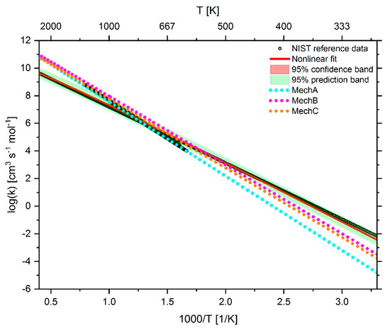 As can be seen in Figure 4, at temperatures in excess of approximately 400 K, the reaction rate coefficient of reaction 42 in MechB lies within the 95% prediction band of the fit function, but below all reference data. This was due to the fact that the target in [7] was to optimized the mechanism for a specific parameter range. However, since the focus of the current study is on developing a mechanism for a larger parameter range, the parameter adjustments carried out in [7] were revised so that for temperatures higher than 300 K the resulting temperature-dependent reaction rate coefficient of reaction 42 in the resulting mechanism MechC is within the range of reference data. In the case of reaction 44 and 45, only minor adjustments were made for fine-tuning, with the pre-exponential factors remaining unchanged, the temperature exponent being increased and decreased from 0 to 0.02 and –0.05, respectively, and the activation energy being reduced by 7.7% and 6.7%, respectively, compared to the original parameters of the San Diego mechanism.