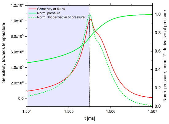 where is the n-dimensional vector of the mass fractions of the n species considered by the mechanism, is the temperature, the velocity field, represents the spatial differential operator, and the chemical source term. In the course of the analysis, the influence of a small perturbation of the reaction rate coefficient on the concentration of a selected species is investigated. A detailed mathematical description can be found in [96,97]. All species considered by the mechanism, as well as the temperature, can be selected as an analysis target in LOGEresearch. Since the IDT- and temperature-sensitivity are correlated as shown by Ji et al. [98], the temperature was chosen as the analysis target in this study. For the sensitivity analysis, MechA was used to avoid any influence from the Arrhenius parameter adjustments made. As an example, Figure 7 shows the time-dependent sensitivity curve of reaction 274 (C7H16 + OH ↔ H2O + n-C7H15). In addition, the pressure curve and the first derivative of the pressure curve is shown. When searching for the maximum positive or negative sensitivity value, only the range of values between the simulation start and ignition (maximum of first derivative of pressure curve) of the mixture was considered. In the diagram, this range is highlighted in blue. The temperature-dependent course of the maximal sensitivity values can be seen in Figure 8 for the 16 most sensitive reactions.