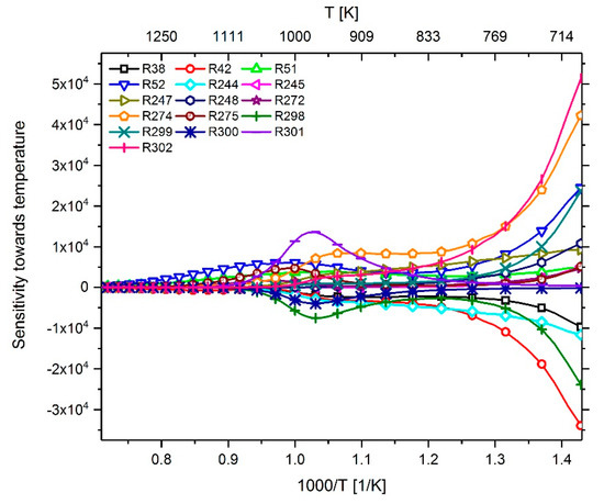 Reaction sensitivity towards temperature simulated with mix 9 from Table 1.