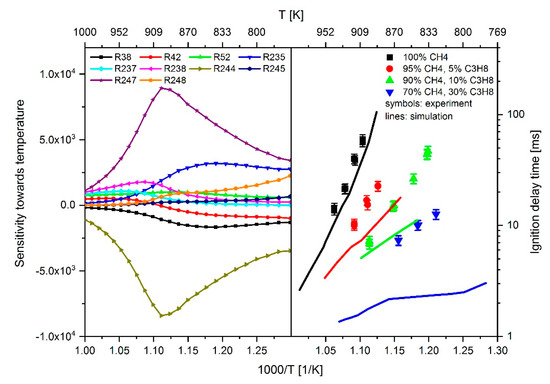 In Figure 3, amongst others, the IDT of a methane–air mixture without propane addition and a propane admixture of 5, 10, and 30 mol% is shown. It can be observed that the deviation between measured and calculated IDTs increases with increasing propane concentration, suggesting that the IDT-reducing effect of the propane addition is overestimated by the mechanism. In order to determine which reactions have a significant effect on IDT in a methane–propane–air mixture, a sensitivity analysis towards temperature was performed with MechA. For the analysis, mix 4 in Table 1 with a propane content of 30 mol% was used. The left side of Figure 10 shows the temperature-dependent progressions of the 10 most sensitive reactions. For the sake of completeness, the measured IDTs and the values calculated with MechA for methane–propane mixtures with 0, 5, 10, and 30 mol% propane content (mix 1 to 4 in Table 1) are shown on the right-hand side of Figure 10.