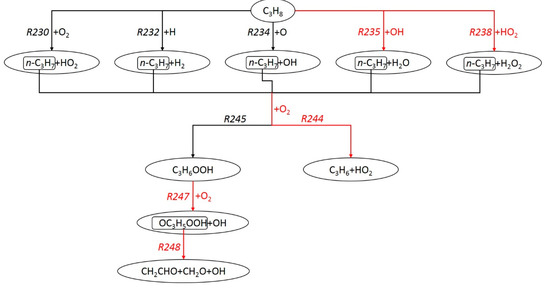 Extract from the propane oxidation scheme derived from MechA. Reactions with modified Arrhenius parameters to improve the calculation of the propane influence on the IDT are labeled in red.