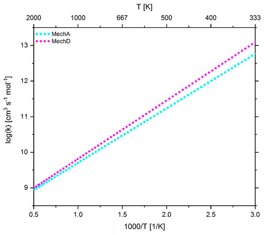 As described in the previous chapter, reference data from the NIST chemical kinetics database were used, if available, to evaluate the effect of changes in the Arrhenius parameters on the reaction rate coefficients. In the case of reaction 235, six entries [39,79,99,100,101,102] were available in the temperature range 250 to 1220 K. For reaction 238, two entries [103,104] could be found in the database for temperature values between 300 and 2500 K. However, for adjusting the Arrhenius parameters of reaction 238, the parameters used in the AramcoMech 3.0 [105] mechanism served as template. In total, nine sources [18,73,103,106,107,108,109,110,111] were available for comparison purposes for reaction 244 between 296 and 2000 K. No reference data were included in the NIST database for reactions 247 and 248, which is why a graphical comparison with reference data is missing. Therefore, care was taken not to make too large changes to the parameters. The pre-exponential factors and the temperature exponents of the reaction 247 and 248 remained unchanged, the absolute values of the activation energy were increased by 7.1% and 9.3%, respectively. Figure 12, Figure 13, Figure 14, Figure 15 and Figure 16 shows the temperature-dependent course of the reaction rate coefficients before (MechA) and after parameter adjustment (MechD).