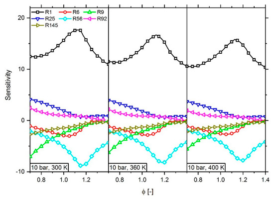 Analysis of the most sensitive reactions regarding the laminar flame speed as function of the fuel–air equivalence ratio ϕ using a methane–air mixture at 300 (left), 360 (middle), and 400 K (right) and 10 bar.