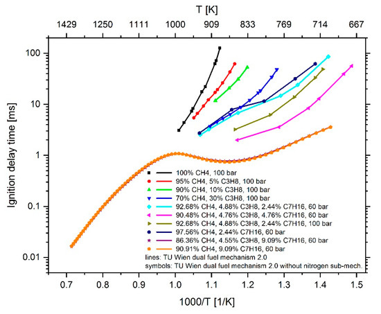 IDT simulation with the TU Wien dual fuel mechanism 2.0 (lines) and the TU Wien dual fuel mechanism 2.0 without the nitrogen sub-mechanism (symbols). The respective content of methane, propane and n-heptane is given in mol% and corresponds to the values in Table 1.