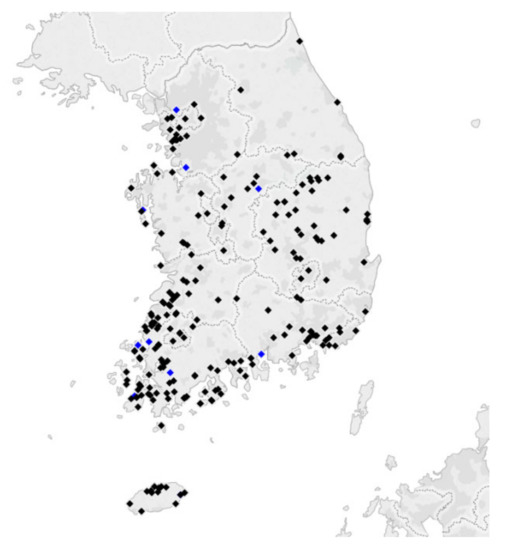 The stratified random sampling method was used to calculate the appropriate size of the sample for each province, which accounted for 242 if the numbers were rounded up, with the study sample being larger than 40% of the total number of PV power plants in the country (Table 1). Almost 50% of the PV power plants were located in Jeollanam-do and Gyeongsangbuk-do (Figure 1).