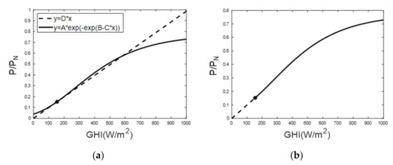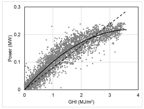 Figure 2 shows a typical PV module performance with respect to solar irradiation. Because of the nonlinearity of the PV module performance [19], a linear regression depicted as a dashed line was unsuitable for expressing the performance curve of the PV module.
