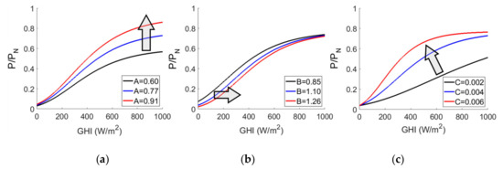 Figure 3 shows the effects of the coefficients: A controlled the asymptote maximum upward and downward, B shifted the curve left and right, and C changed the growth rate. Its sigmoid shape was asymmetrical and had an inflection point that converges to a maximum value, which was ideally PN, as the PV power output generally bended to the nominal capacity.
