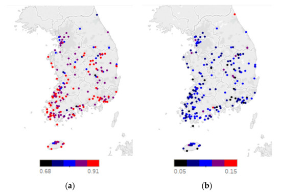 Figure 5 shows the spatial distribution of R2 and nRMSE of the Gompertz model over South Korea, in which no obvious spatial pattern can be observed, i.e., a random pattern was present. For reference, the correlation coefficient between R2 and nRMSE was −0.86.