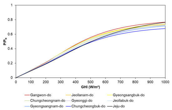 First, the hourly PV power output P (kW) at each power plant was normalized by dividing it by its nominal capacity PN (kW). Second, a regression analysis was conducted to find the best fitness between the hourly GHI and the normalized PV power output by employing the Gompertz function.