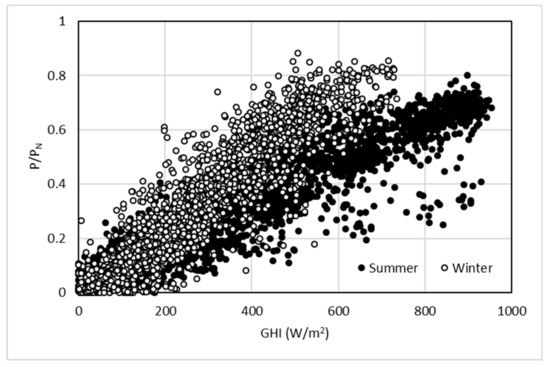 Not only PV power forecasting for peak load control, but also evaluations of PV potential for the establishment and management of the national supply target, require a simple yet reliable performance curve of PV systems as a function of solar irradiance [10]. Therefore, the primary purpose of this study was to derive a generalized performance curve of PV systems by correlating the PV power output of the nation’s PV power plants and the satellite imagery-based solar irradiance at their locations all over the country.