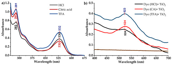 Absorption spectra of mortiño methanolic extracts acidified with HCl, citric acid and TFA are shown in Figure 1a; these exhibit two absorption bands (λmax) at 280 and 530 nm which are characteristic of anthocyanins. The band absorption with λmax at 530 nm is assigned to derived cyanidins such as 3-glucoside and 3-galactoside dissolved in methanol acidified with HCl, as previously reported [28,32,33]. However, the possibility of finding anthocyanins with different λmax that overlap and contribute to this band must be considered; e.g., anthocyanidins can also present absorption into this wavelength portion [34]. The absorption interval shown in the visible range between 47550 nm allows the harvesting photons, which is necessary for sensitization in a solar cell. Absorption spectra of the dyes adsorbed on TiO2 are shown in Figure 1b; their λmax are displaced between 6 and 11 nm in comparison to the absorption band of the dyes alone. This hypsochromic effect shows an interaction between the pigment and the semiconductor; it corresponds to changes in the energy levels in the pigments (HOMO and LUMO), which affect the band gap of TiO2. The displacements of λmax are comparable to previous reports where anthocyanin sensitizers were used [35,36], this corroborates the chemical adsorption of anthocyanin on TiO2 [36].