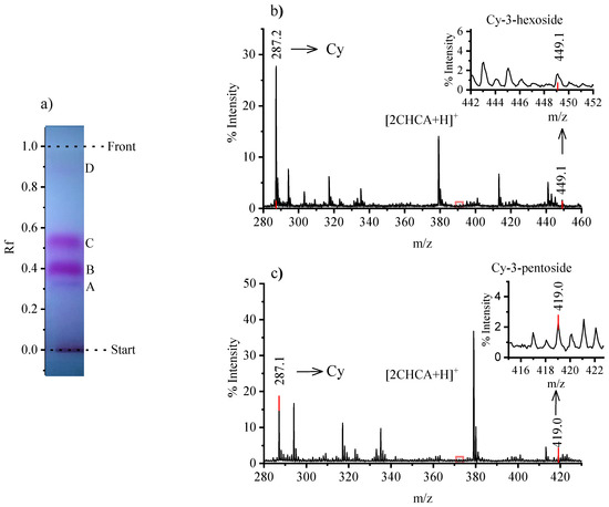 (a) Anthocyanins separated by TLC from mortiño extract (mobile phase: BAW 40:10:15, stationary phase: silica gel F270). MALDI spectra (CHCA matrix) of (b) cyanidin-3-hexoside and (c) cyanidin-3-pentoside fraction.