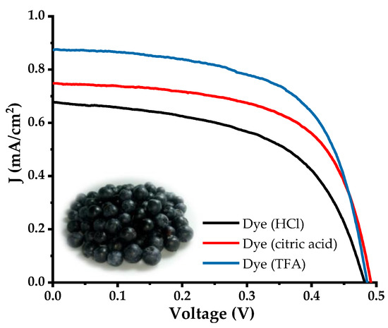 The ANOVA test shows that the efficiency (η) of DSSC is affected by the use of different acids in dye extraction. The differences are significant between the HCl and TFA, while citric acid does not give a significant difference. The highest efficiencies in solar cells belong to TFA and coincide with the dye extracts that have the highest amounts of anthocyanins, as can be seen in 3.1. The greater efficiencies achieved using the extract with TFA might be the result of the greater quantity of disposable anthocyanins to attach on TiO2, which would help to greater capture photons on the photoanode. In contrast, the lower efficiencies were obtained with HCl, although the lowest anthocyanins content corresponds to citric acid. This disagreement suggests that DSSC performance not only depends on the concentration of dye, but also other characteristics such as the nature of acid in the extraction can affect the performance of DSSC. The best performance is shown when organic acids such as citric acid and TFA are in extraction medium. Those organic acids promote an improvement in the electrical contact of TiO2 by the addition of carboxylate groups that block recombination processes between TiO2 and electrolyte and enhance JSC, which is similar to that which occurs in treatments with organic acids as co-adsorbents [12,38]. Parameters like short circuit current density (JSC), open circuit potential (VOC) and fill factor (FF) were determined, and their differences in DSSC performance are not considerable.