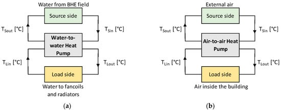 Scheme of HP operating conditions, (a) water-to-water HP, (b) air-to-air HP (without heat recovery).