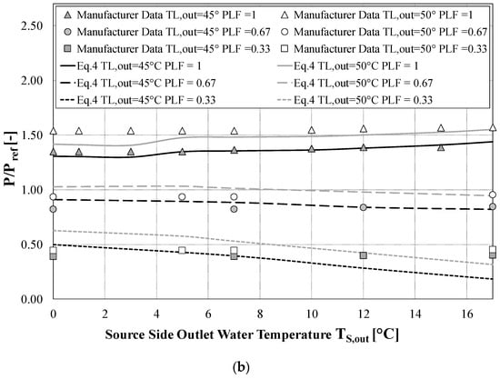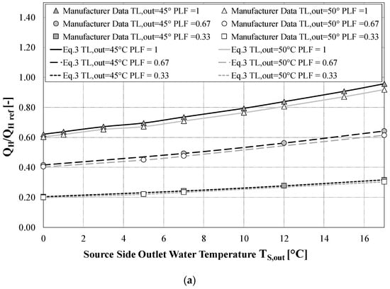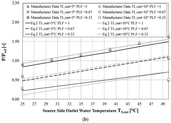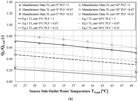Figure 2 and Figure 3 compare the manufacturer data with the values obtained with the correlations 1–4 using the optimum calculated coefficients of Table 4. In particular, the graphs show the cooling/heating capacities and the power consumptions for cooling and heating, respectively, as a function of the source side outlet water temperature TS,out with the load side outlet water temperature TL,out as a parameter and considering the three conditions of load, namely PLF = 1, 0.67, 0.33.
