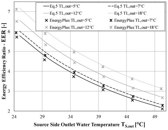 By means of EnergyPlus simulations using “equation fit models”, the variables EER and COP of both the heat pumps were evaluated for selected couples of source side and load side temperatures. For the water-to-water heat pump, the effect of the water volumetric flow rates (source and load side) was also taken into account by employing the manufacturer data related to the partial load factor (PLF) effect. For the air-to-air heat pump, the original contribution of the present study is the analysis of the suitable input datasets in case of unconventional heat pumps like the one with energy recovery here considered.