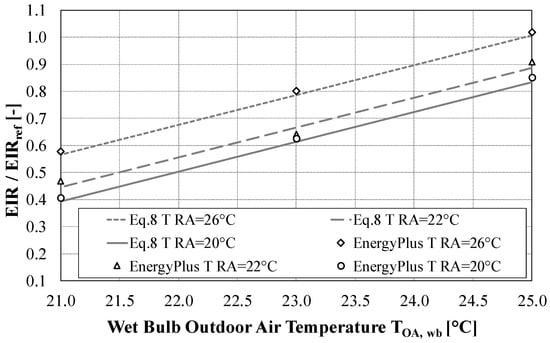 Assuming constant supply air volumetric flow rate as operating conditions, the cooling and heating capacities and the EER and COP (and EIR = 1/EER) are only depending on temperatures and the selected equations to model the air-to-air heat pump are biquadratic ones. In particular, the performance depends on the “load air wet-bulb temperature” TL,in wb and the “source air dry-bulb temperature” TS,in db in cooling mode and on the “load air dry-bulb temperature” TL,in db and the “source air dry-bulb temperature” TS,in db in heating mode.