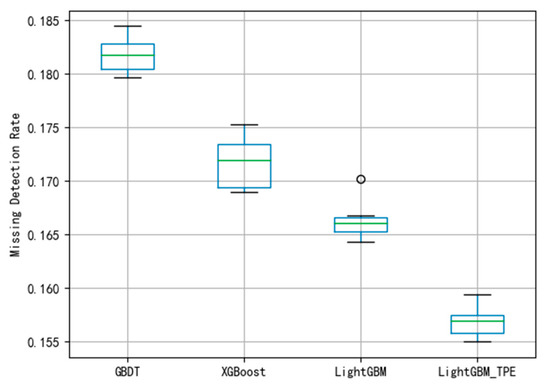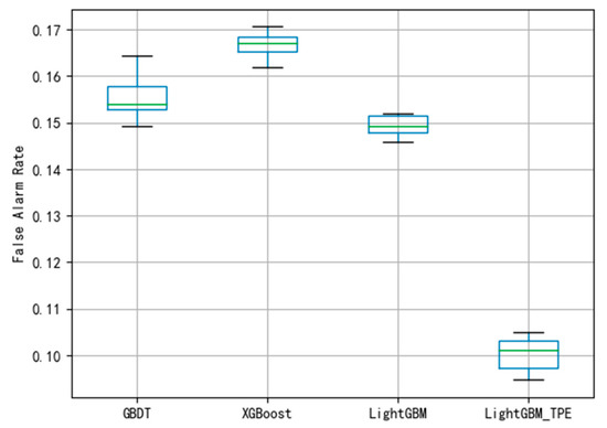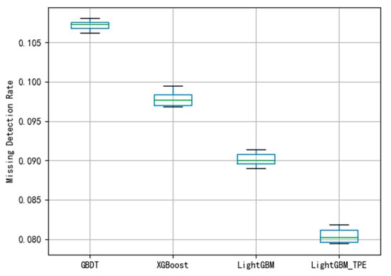 As shown in the following figure, there are box plots of FAR and MDR under four different algorithms: GBDT, XGBoost, LightGBM, and LightGBM_TPE.