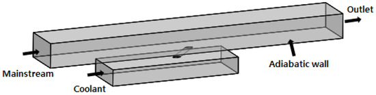 To explore flow characteristics, the three-dimensional (3D) Reynolds-averaged Navier–Stokes (RANS) equation was employed to calculate the area for analysis, and ANSYS-CFX Ver. 17.0 was utilized as a flow analysis code. A high Reynolds number was utilized for a turbulence model along with the k–ε model, which is appropriate when the wall viscous force is dominant. Viscosity and insulation conditions were applied to all wall surfaces. In the numerical analysis, the boundary conditions were made identical to those in the experiment [2] by setting the operating pressure at 1 atm, main flow temperature and cooling fluid temperature at 330 K and 300 K, respectively, main flow velocity at 11 m/s, and blowing ratio (M) at 1, as listed in Table 1.