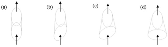 Schematic view of the backward injection film cooling hole: (a) 0°; (b) 30°; (c) 60°; (d) 90°.