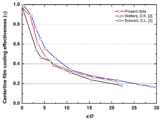 Centerline film cooling effectiveness comparison of present data and previous studies.