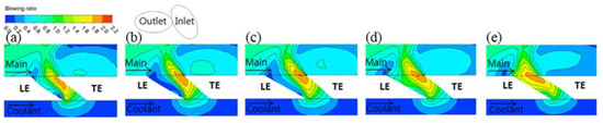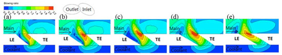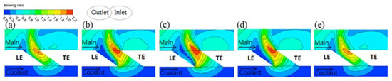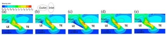Figure 5 shows the velocity distribution in the flow cross-section toward the XY-direction at each position when the film cooling hole inlet angle was 0°. As the cooling fluid flowed into the channel, it leaned toward the trailing edge inside the channel owing to fluid inertia, as shown in Figure 5a–e. In particular, the cooling fluid was concentrated in the trailing-edge side of the central part of the film cooling hole channel, as shown in Figure 5b–d. As a result, the cooling fluid supply became insufficient in the leading-edge area inside the film cooling hole channel, which caused main flow influx from the leading edge of the cooling hole outlet.