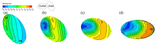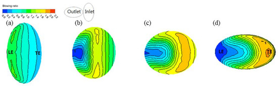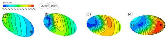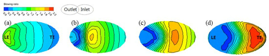 When the film cooling hole inlet angle was changed, the relative angle between cooling hole inlet and outlet created rotating components of the cooling fluid. As a result, the cooling fluid further spread across the film cooling hole channel to re-attach some of the cooling fluid to the leading-edge area inside the channel, as shown in Figure 6d. This phenomenon is seen more clearly in Figure 7d and Figure 8b,d. In contrast, Figure 6b and Figure 7b show the re-attachment of the cooling fluid around the leading edge inside the film cooling hole channel.
