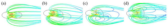 Streamline of cooling fluid according to the inlet angle of hole: (a) 0°; (b) 30°; (c) 60°; (d) 90°.