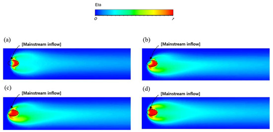 In particular, the area of the main flow influx was approximately half of the cooling hole in the 0° inlet angle case. Near the leading edge of the film cooling hole outlet, the film cooling effectiveness was near 0. This means that the film cooling coolant did not spread on the whole of the film cooling hole outlet owing to the coolant moment inside the film cooling hole channel. Then, the main flow, hot combustion gas, smoothly flowed into the film cooling hole outlet, reducing the film cooling effectiveness at the film cooling hole outlet.