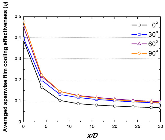 Averaged span-wise film cooling effectiveness according to the inlet angle of the hole.