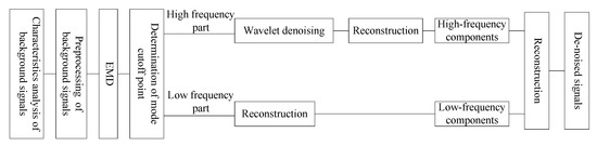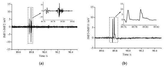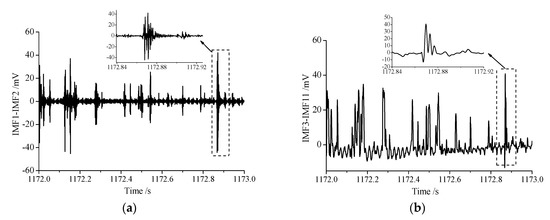 The MS signals actually collected were superimposed by the real signals of different frequency bands and noise. Therefore, the separation of real signals and noise could be realized by removing or reducing the noise bands. Huang [45] proposed the Hilbert–Huang transformation (HHT), which had the characteristics of multi-resolution and good adaptability, and could well realize the noise reduction process of MS signals. HHT is composed of the EMD method and Hilbert transformation, and its core is EMD. Through the EMD method, the signals can be decomposed into a combination of several intrinsic mode functions (IMFs) satisfying the corresponding conditions [45], namely,