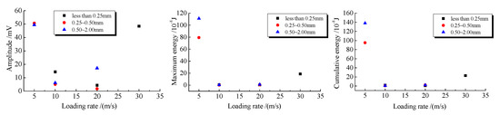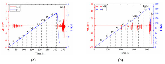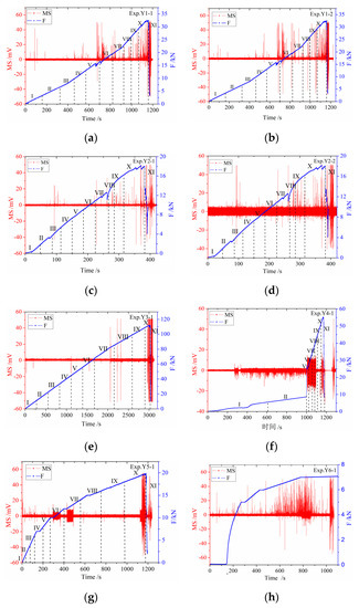 As shown in Figure 5a–g, there were a certain number of MS signals in the early and middle loading stage of six experiments. However, the number of events was small and amplitude change was not evident. There was a quiet period approaching fracture. MS signals in the fracture process had the characteristics of dramatic changes of amplitude and event numbers.