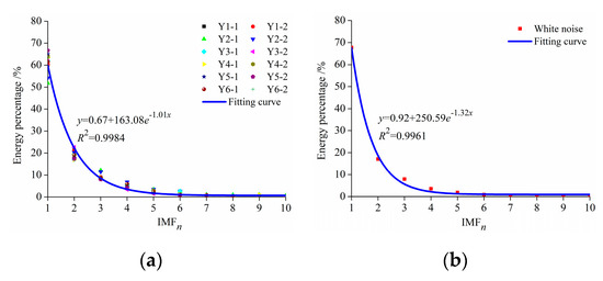 Through the comparative analysis of the IMF energy percentage of signal without an obvious change and white noise signals (as shown in Figure 6), it could be found that the IMF energy percentage of the signal without obvious change had the same change trend with the white noise, which decreased at the exponential decay curve with the increase of decomposition layers, and the attenuation coefficient were 1.01 and 1.32. The energy of high-frequency component (IMF1–IMF2) accounted for about 80% of the total energy, but the energy of the low-frequency component (IMF3–IMF10) and residual were less than 20% of the total energy. It can be considered that when the change of collected signal is not distinct, there is no big difference between the IMF energy percentage change of collected signal and noise, and the main component of the collected signal is the noise dominant component.