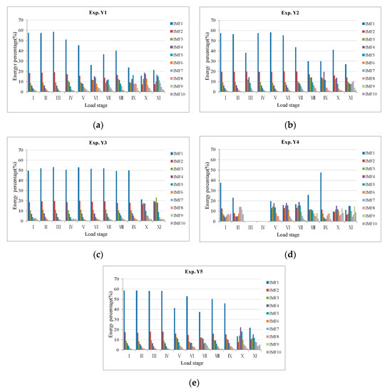 Intrinsic mode function (IMF) energy distribution graph of each load stage in Exp.Y1–Y5. (a) Exp.Y1; (b) Exp.Y2; (c) Exp.Y3; (d) Exp.Y4 and (e) Exp.Y5.
