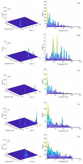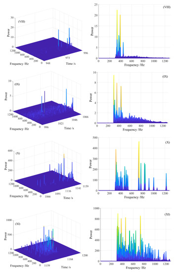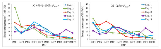 The MS signal was the strongest in the ⬤ stage, which mostly occurred in the fracture process (X) and after fracture (XI). The energy percentages of IMF1 and IMF2 severely reduced to 20–40%, and the energy percentages of IMF3-10 were sharply increasing. There was a distinct local energy minimum. As shown in Figure 9, the orders of the first energy minimum were all 2 expect that was 3 in Exp.Y2. The event count rate of Exp.Y2 was much less than the other five experiments though the amplitude had no great difference with the other experiments (as shown in Figure 5 and Table 6), which resulted in the difference of the order of mode cutoff point between the Exp.Y2 and the other experiments. Thus, it could be seen that the order of mode cutoff point was determined both by the amplitude and event count rate.